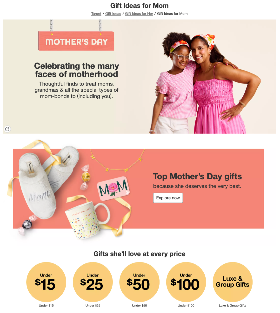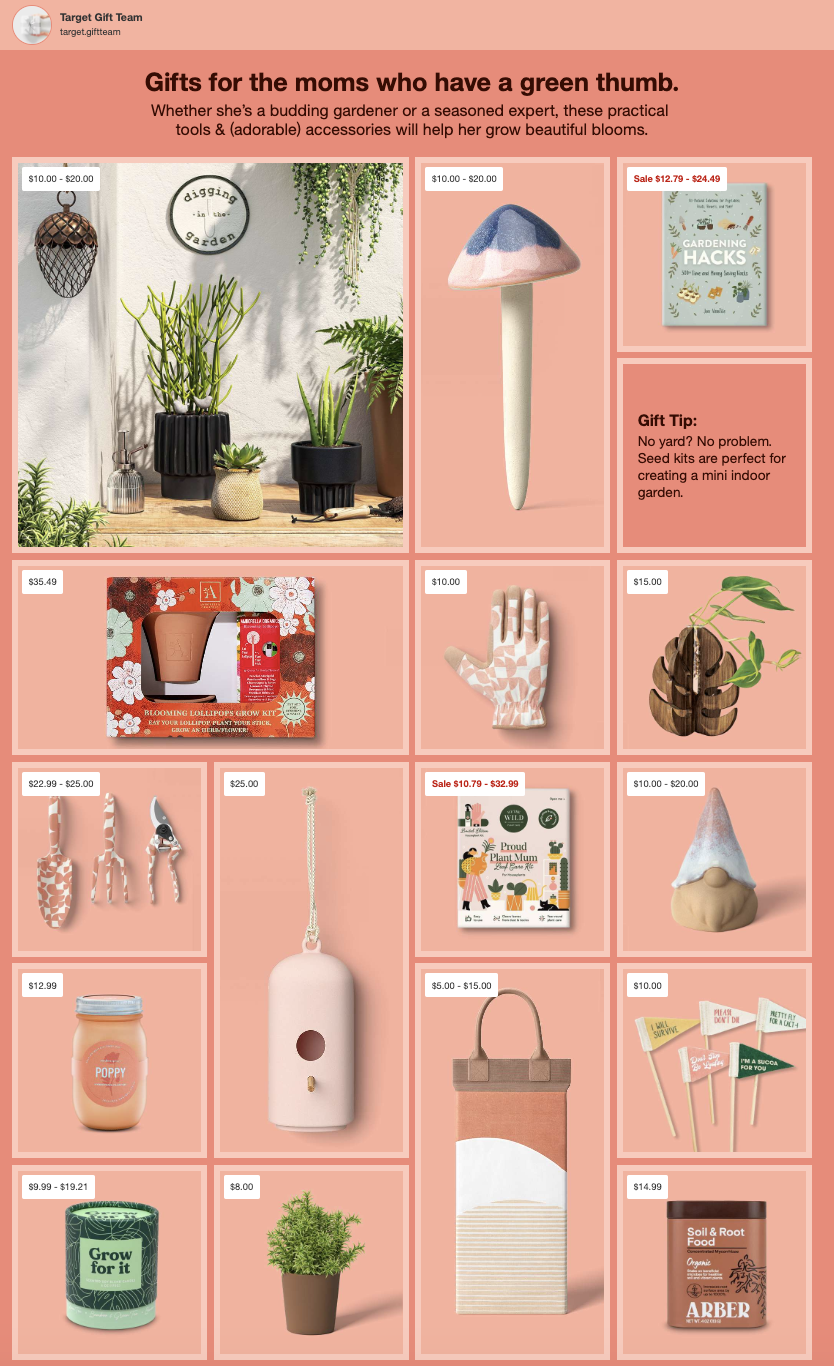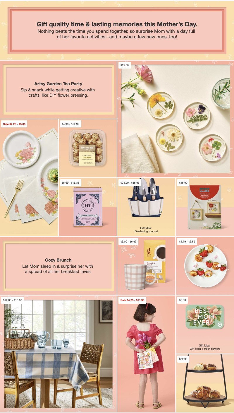I was the copywriter for Target’s 2024 Mother’s Day digital campaign, responsible for crafting engaging, on-brand copy across the website and digital gift guides. This included the main Mother’s Day landing page, multiple curated gift guides, and ongoing homepage updates in the weeks leading up to Mother’s Day—all on Target.com