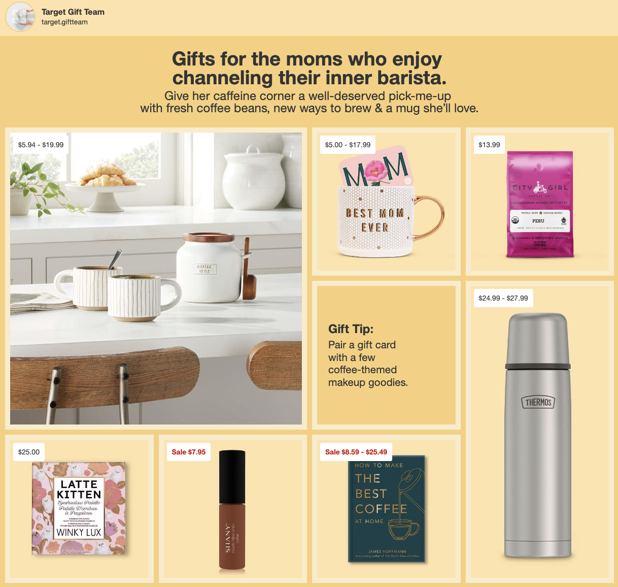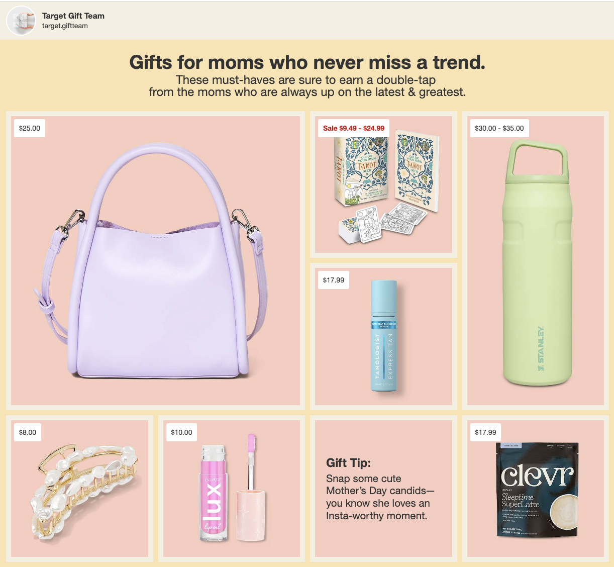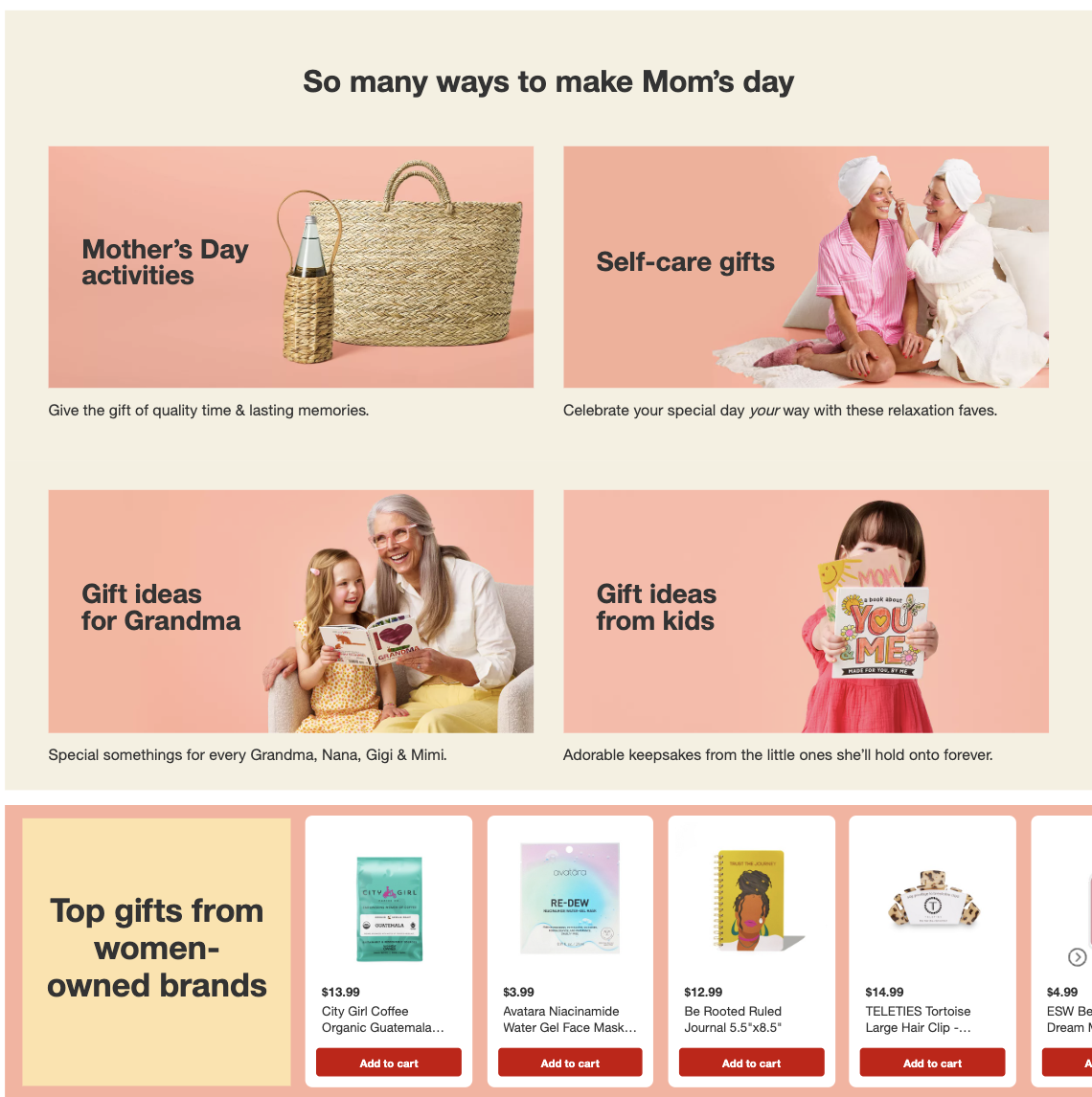 I was the copywriter for Target’s 2024 Mother’s Day digital campaign, responsible for crafting engaging, on-brand copy across the website and digital gift guides. This included the main Mother’s Day landing page, multiple curated gift guides, and ongoing homepage updates in the weeks leading up to Mother’s Day—all on Target.com